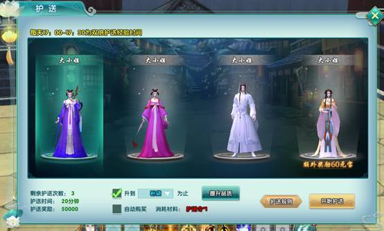 每天可以参与3次运镖,每次运镖完成,都可以获得对应镖车品质的奖励。
